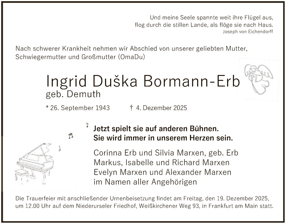 Laßt mich los und vergesst mich nicht und ich werde in Euren Herzen weiterleben.